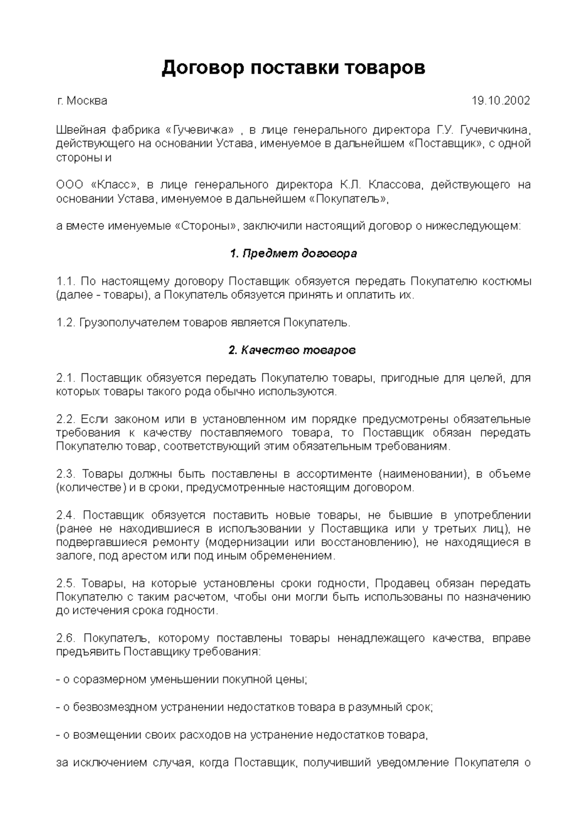 Договор поставки образец заполненный пример