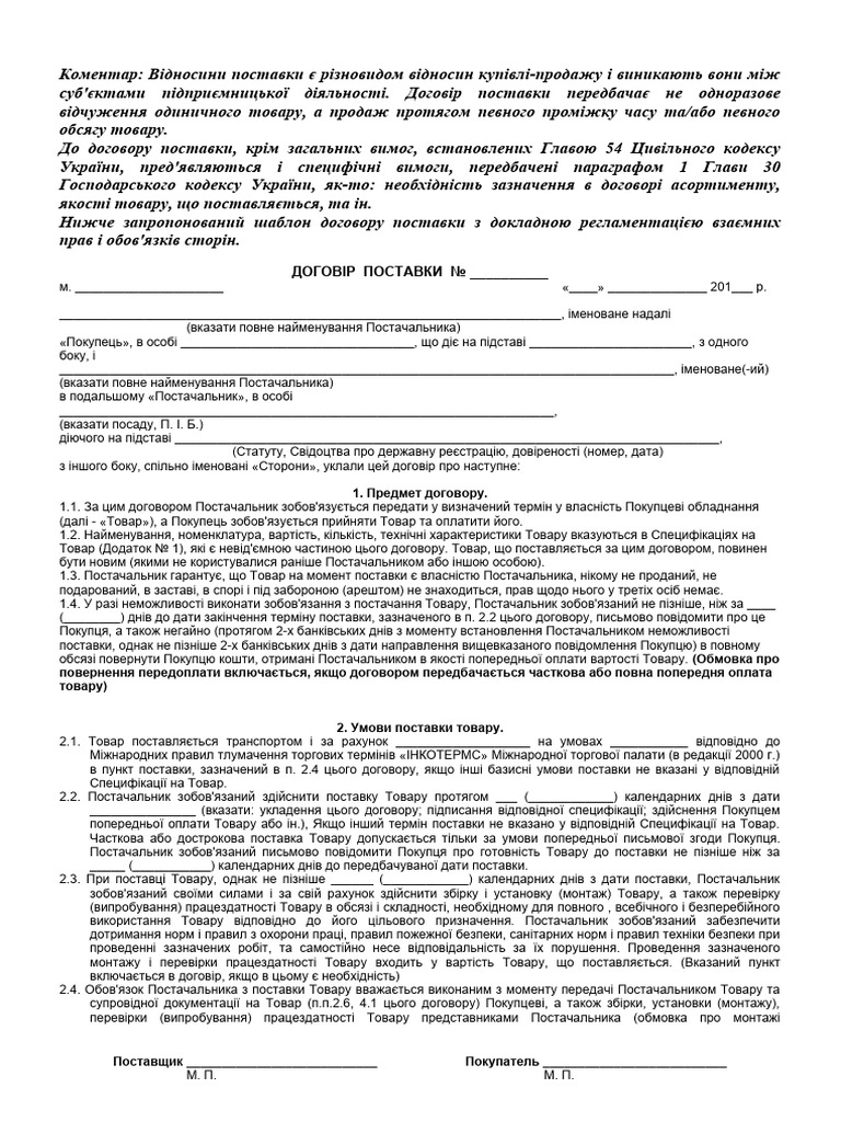 Типовий договір поставки обладнання